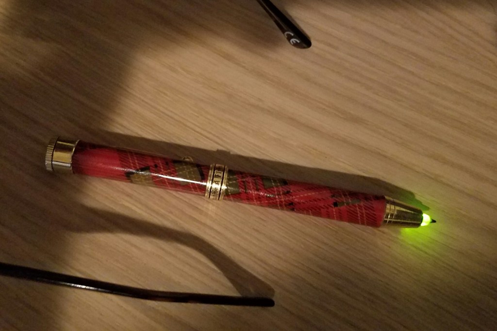 That night as I was getting ready for bed and flicking covers this way and that, making myself a cozy spot like a rotating tired mutt, I saw my dad looking down upon me once again; but this time his hair was tidy. He handed me a pen and showed me how it lit up at the tip. He said I should use it if I needed to write down my thoughts in the middle of the night or if there was ever a blackout and my message was needed for immediate governmental covert Intel.